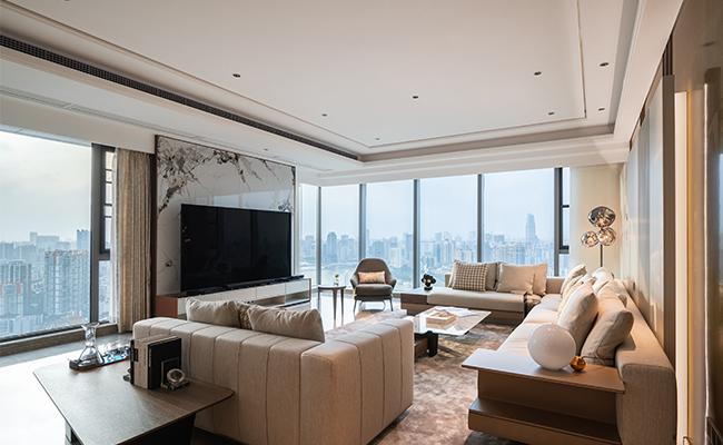 以 “奢雅有度的都市會客廳” 為核心:用米金基底鋪陳溫潤質(zhì)感,大理石墻與金屬吊燈點綴精致,柔化奢華的銳利感;跳紋單椅與肌理地毯激活空間層次,既保視覺張力又不張揚。開放式餐廚與客區(qū)連通,弧形吊頂引光漫入,讓場域在開闊通透中,兼具 “社交的體面” 與 “居家的松弛”,適配都市高階生活的多元需求。