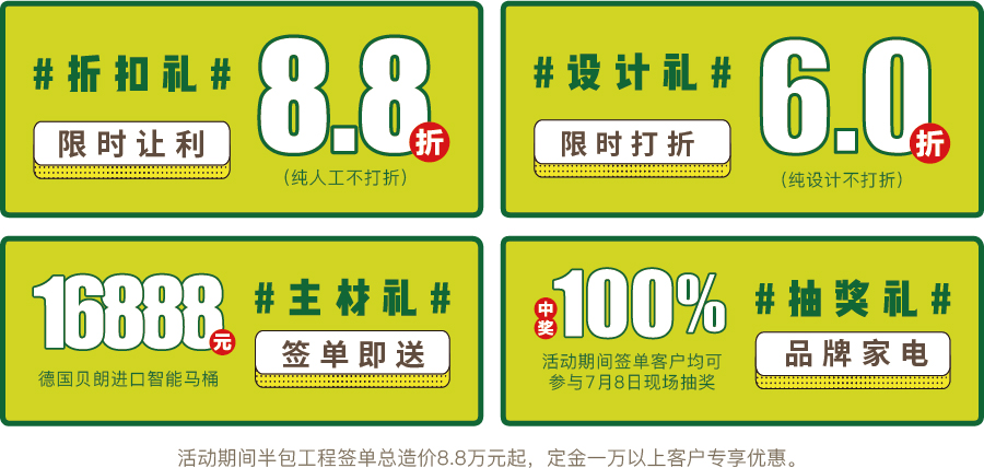 活動(dòng)期間(6月17日-7月8日),簽單下定業(yè)主可享受設(shè)計(jì)費(fèi)6折,人工8.8折簽單優(yōu)惠,還可獲贈(zèng)價(jià)值16888元德國(guó)進(jìn)口貝朗智能馬桶一個(gè),7月8日可到財(cái)富廣場(chǎng)東塔參與品牌家電抽獎(jiǎng),百分百有獎(jiǎng),數(shù)量有限,抽完即止。