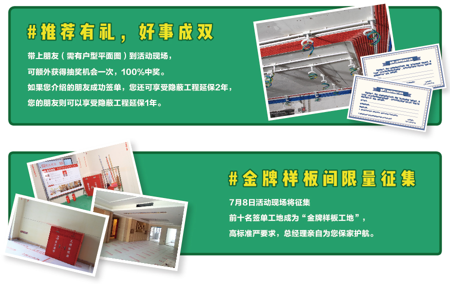 與好伙伴同享好禮,就是節(jié)日的意義。那么,這次驚喜大禮怎能不告訴你身邊的小伙伴呢。推薦好友成功簽單,豪禮翻倍。7月8日活動(dòng)現(xiàn)場(chǎng)推薦好友成功簽單,您 即可享受隱蔽工程延保2年,您的朋友 也能享受隱蔽工程延保1年。好品質(zhì),值得分享。