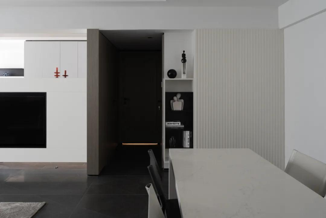 獨(dú)立的玄關(guān)空間成為了室內(nèi)外空間有序轉(zhuǎn)換的入口節(jié)點(diǎn),給室內(nèi)保留了更多的隱私感受。吊燈猶如點(diǎn)睛之筆,讓原本平淡的框形成為獨(dú)具匠心的玄關(guān)端景。