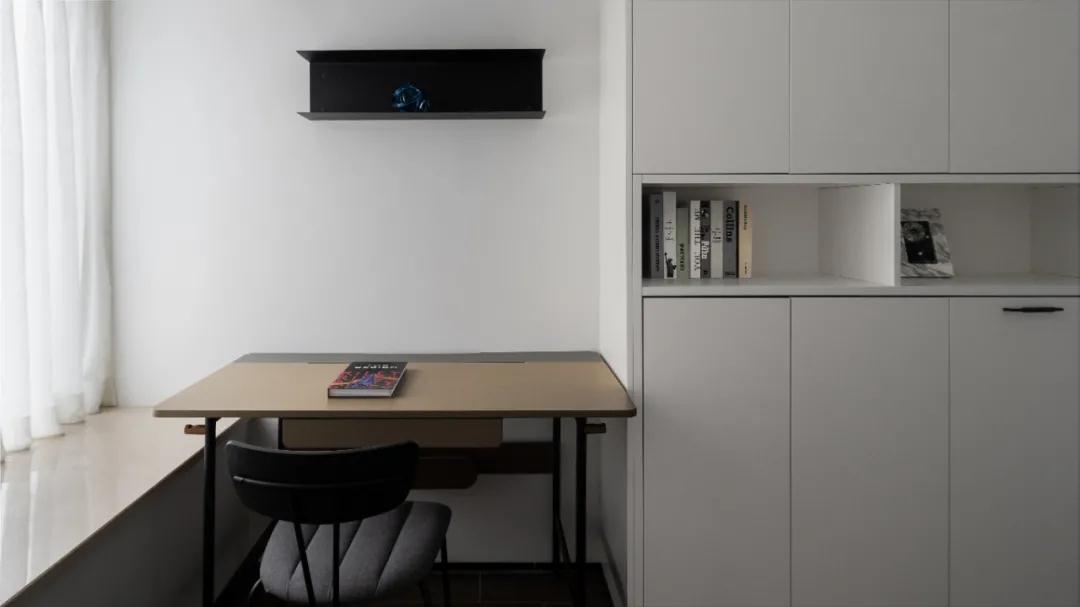由于房子層高還不到2.6米,客廳與書房之間的墻面留出長條形窗口作為連通,從書房看出去,交錯視線,讓整個空間有深遠(yuǎn)不盡的感覺,虛實之間趣味倍增。