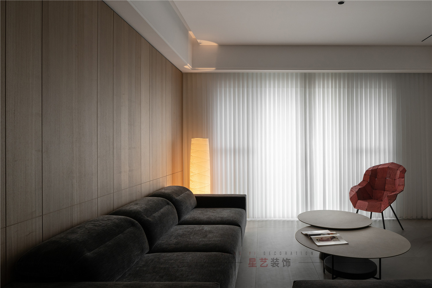 帶有獨(dú)特設(shè)計(jì)的紅椅像把火點(diǎn)亮了整個(gè)空間,小小的點(diǎn)綴卻也是獨(dú)具匠心的設(shè)計(jì)。窗邊的落地暖黃燈光照亮了這大面積深色的環(huán)境,似冬日的暖陽(yáng)給人溫暖,獨(dú)自發(fā)光發(fā)熱。