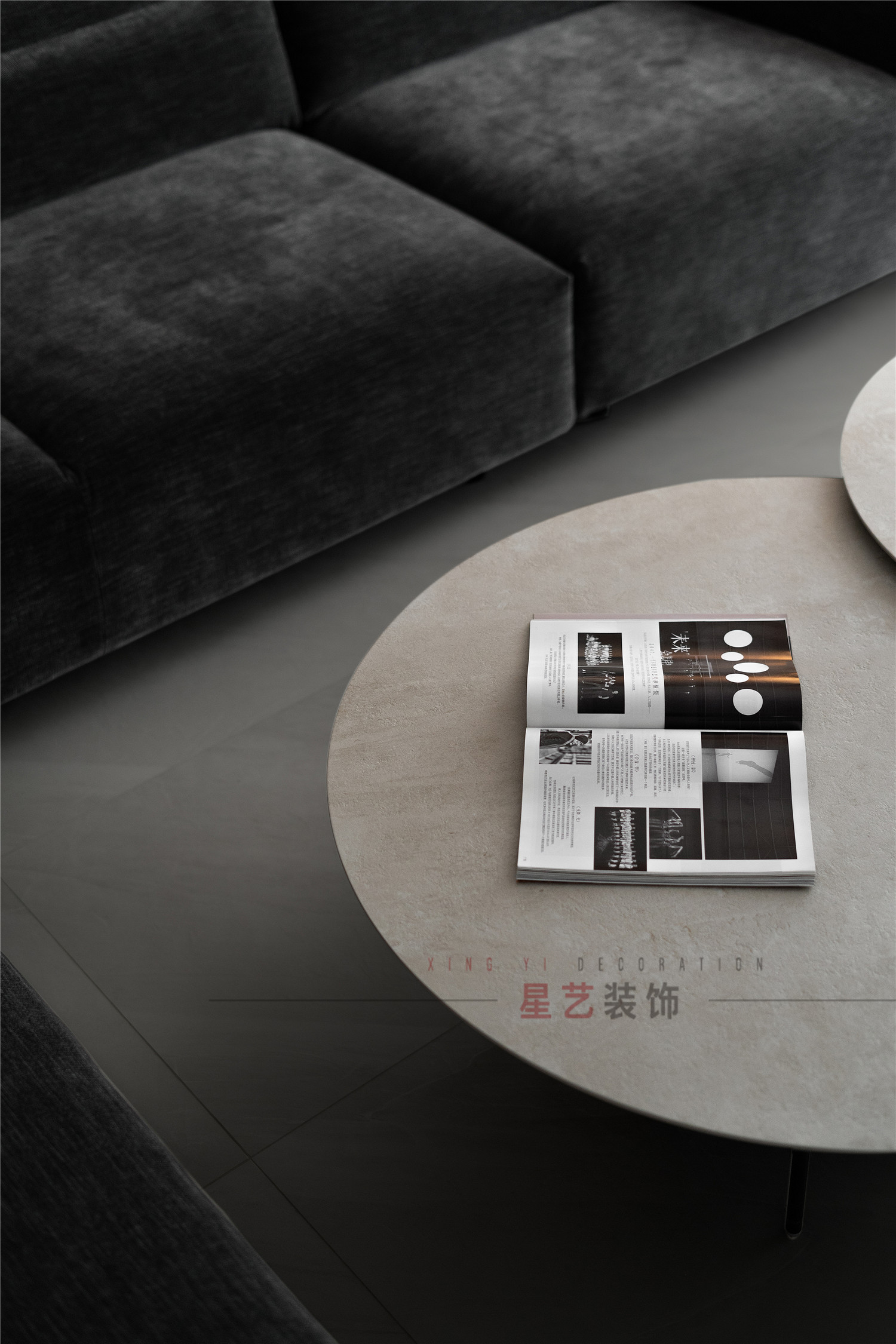 客廳是經(jīng)典的黑白灰設(shè)計(jì),極簡(jiǎn)風(fēng)格盡顯高級(jí)大氣,柔軟舒適的絨面深色沙發(fā)搭配拼接圓桌,簡(jiǎn)約精致又賦予時(shí)尚魅力,整體上僅用色彩的沖擊與家具的質(zhì)感展現(xiàn)設(shè)計(jì)的精妙。