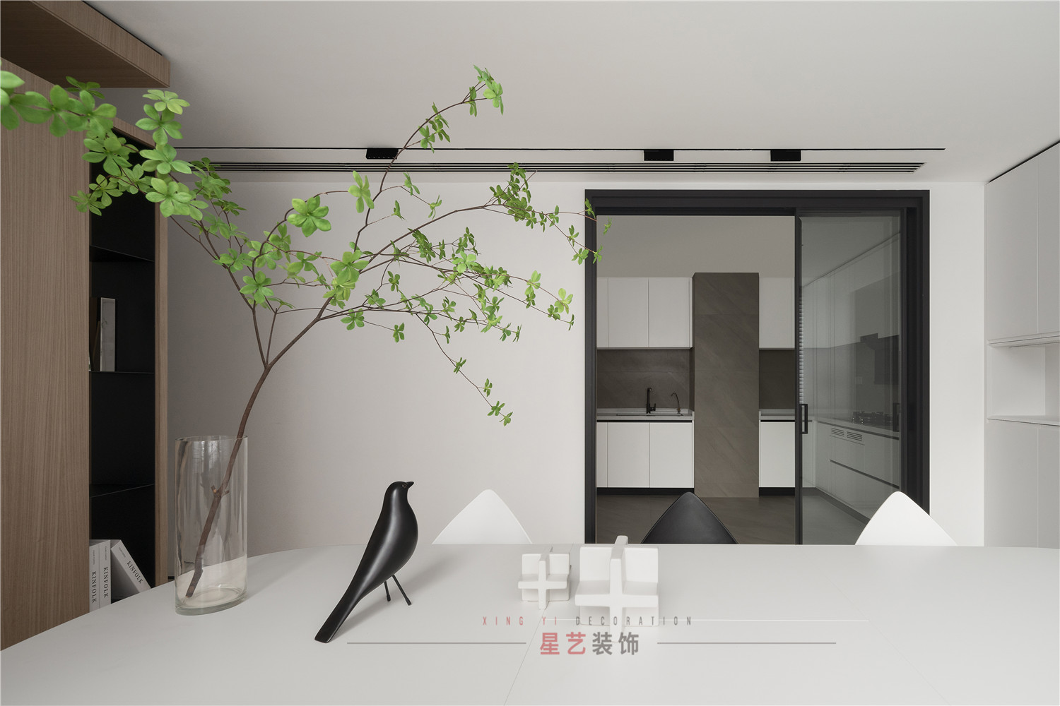 餐廳部分清新明亮,大面積的百葉窗與白色儲(chǔ)物柜在視覺(jué)上延伸用餐區(qū)的空間,黑白相間的桌椅虛實(shí)結(jié)合,讓整個(gè)空間有了沉穩(wěn)的底色,像是化雪后清晨,迸發(fā)勃勃生機(jī)。
