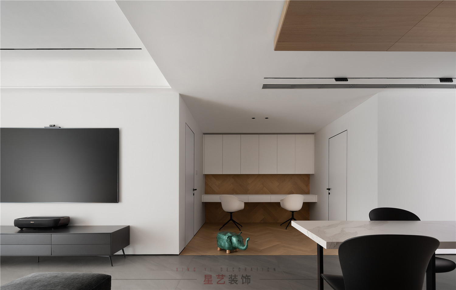 值得一提的是,整個(gè)設(shè)計(jì)都采用了大量的隱形門(mén)設(shè)計(jì),利用空間的錯(cuò)落造成視覺(jué)上落差,既不會(huì)顯得突兀也豐富了整體的空間層次。