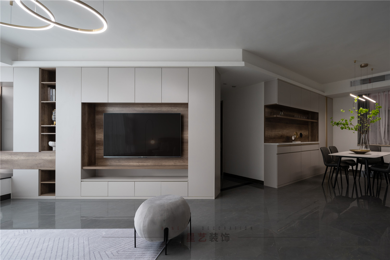 走進大門,迎面的光線穿過屏風給人一絲絲的柔和和神秘,客廳背景設計兼顧儲物和整體的空間提升,開放格的選擇尤為重要。