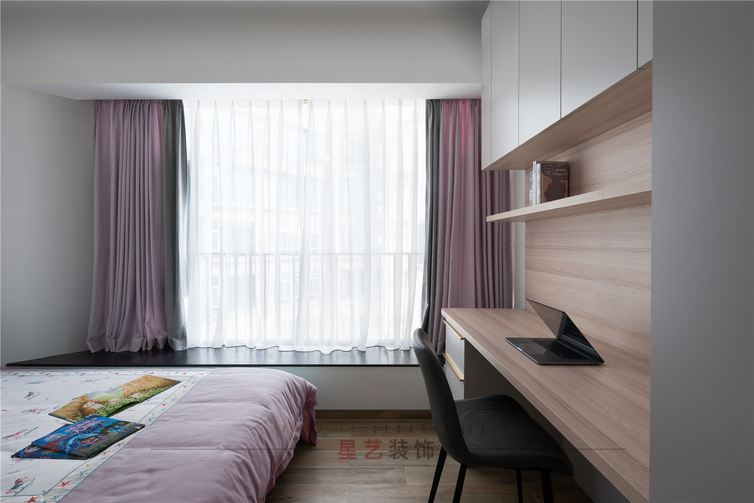 由于工作原因,業主對房間內的最大需求就是大的書桌,在格局上稍微做了調整。原木書桌會更加敞亮柔和,有層次感的色彩也能減少工作或者閱讀的疲勞感。體驗休憩于家的那份寧靜與愜意。