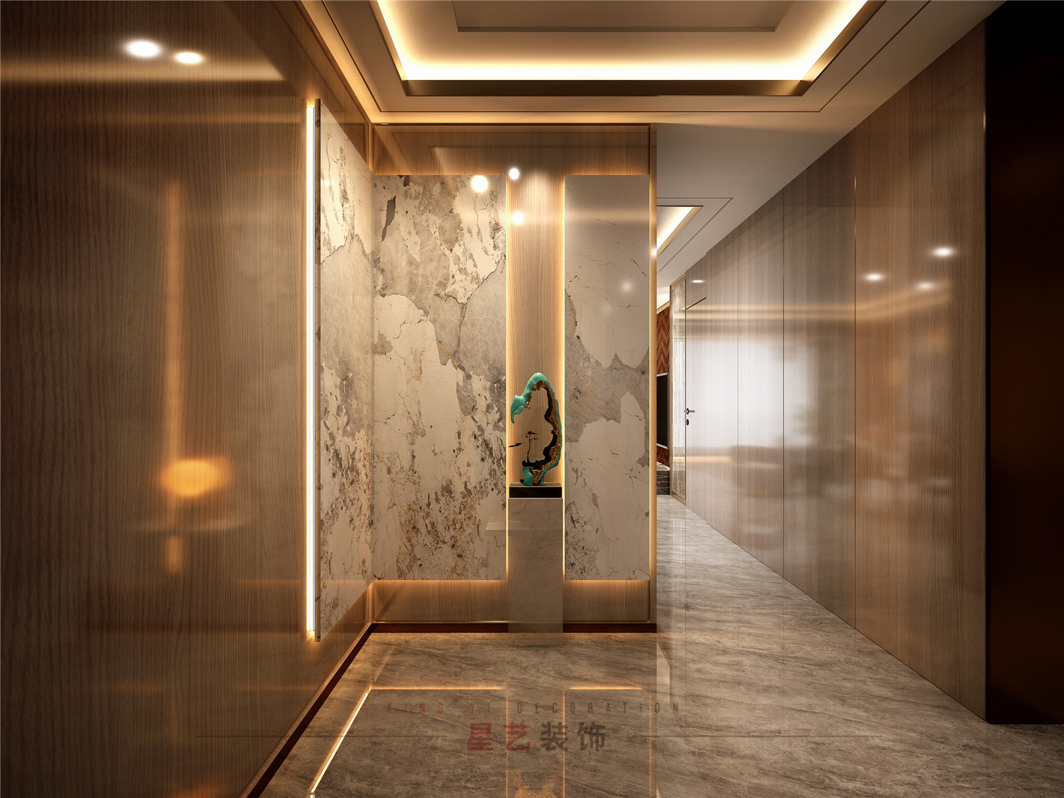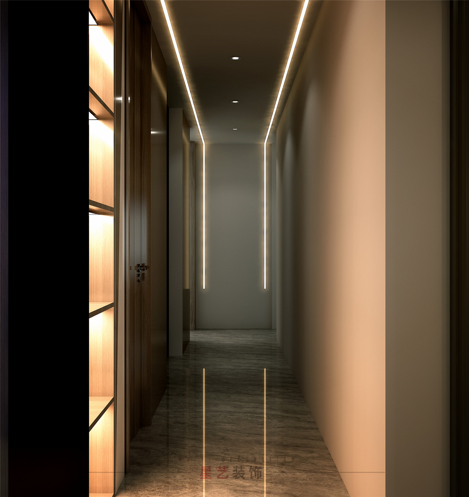 進來玄關(guān),滿眼都是余暉落日中的浩瀚星空。輕奢細致的軟裝布置與現(xiàn)代材質(zhì)組合,尤其是靈活的線燈布置,上一秒沉溺于晚霞的浪漫,下一秒便回歸科技生活,使“自然”與“奢華”這兩種不同的氣質(zhì)得以共生。