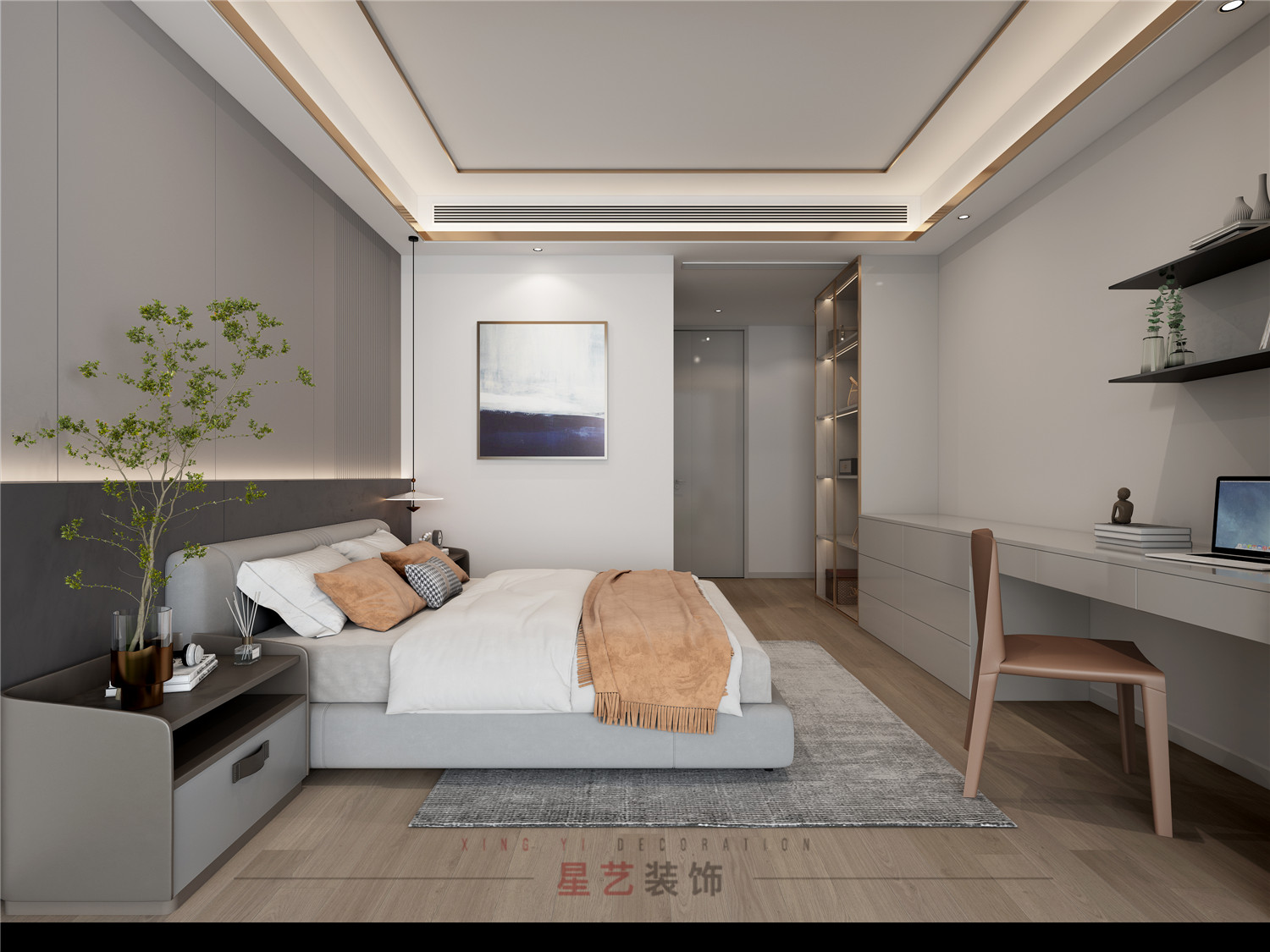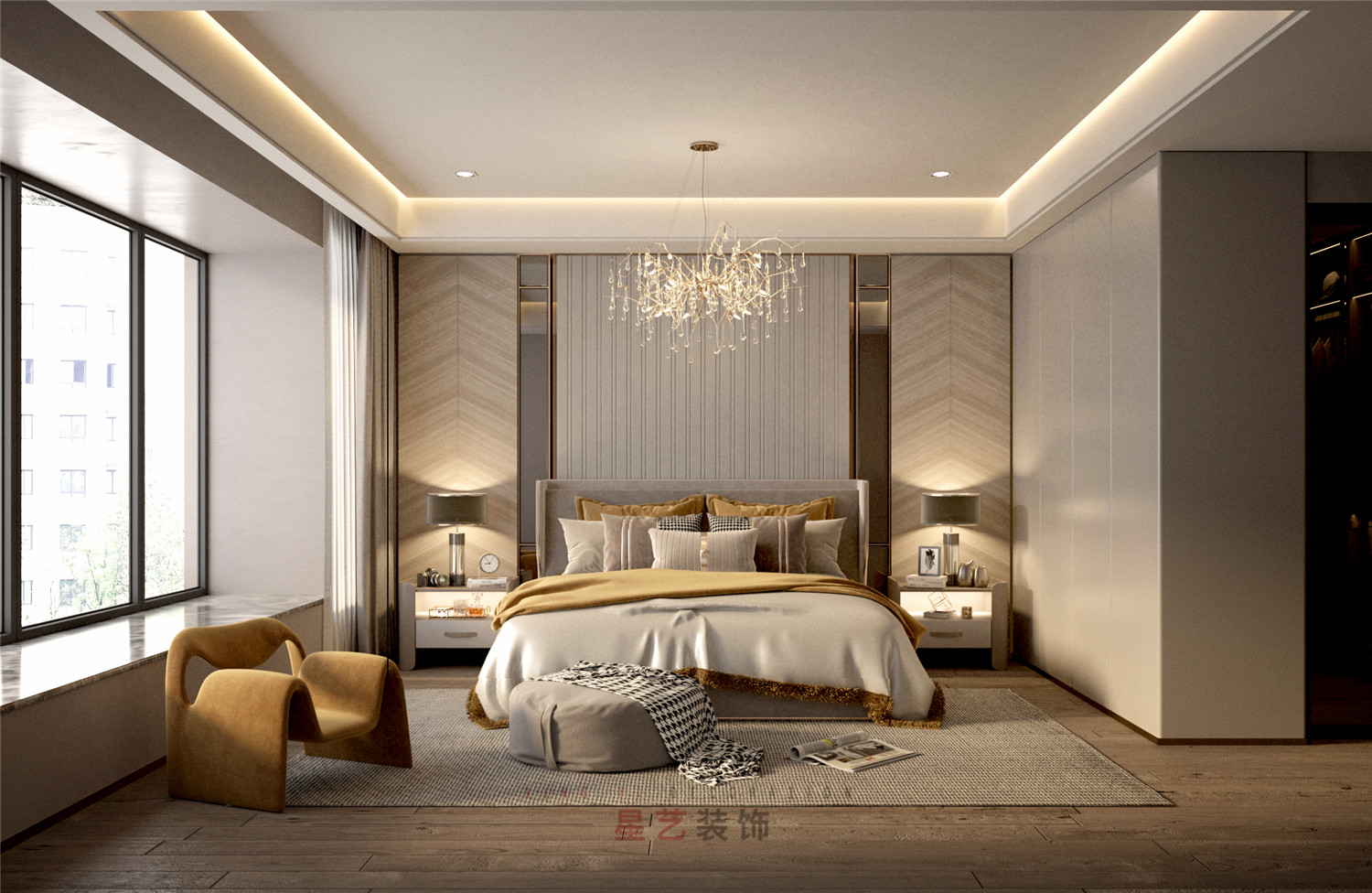 主人房與長輩房風(fēng)格比較相似,對稱式的空間分割方式表現(xiàn)出細膩的質(zhì)感層次,布局上疏密有度,簡繁相適。