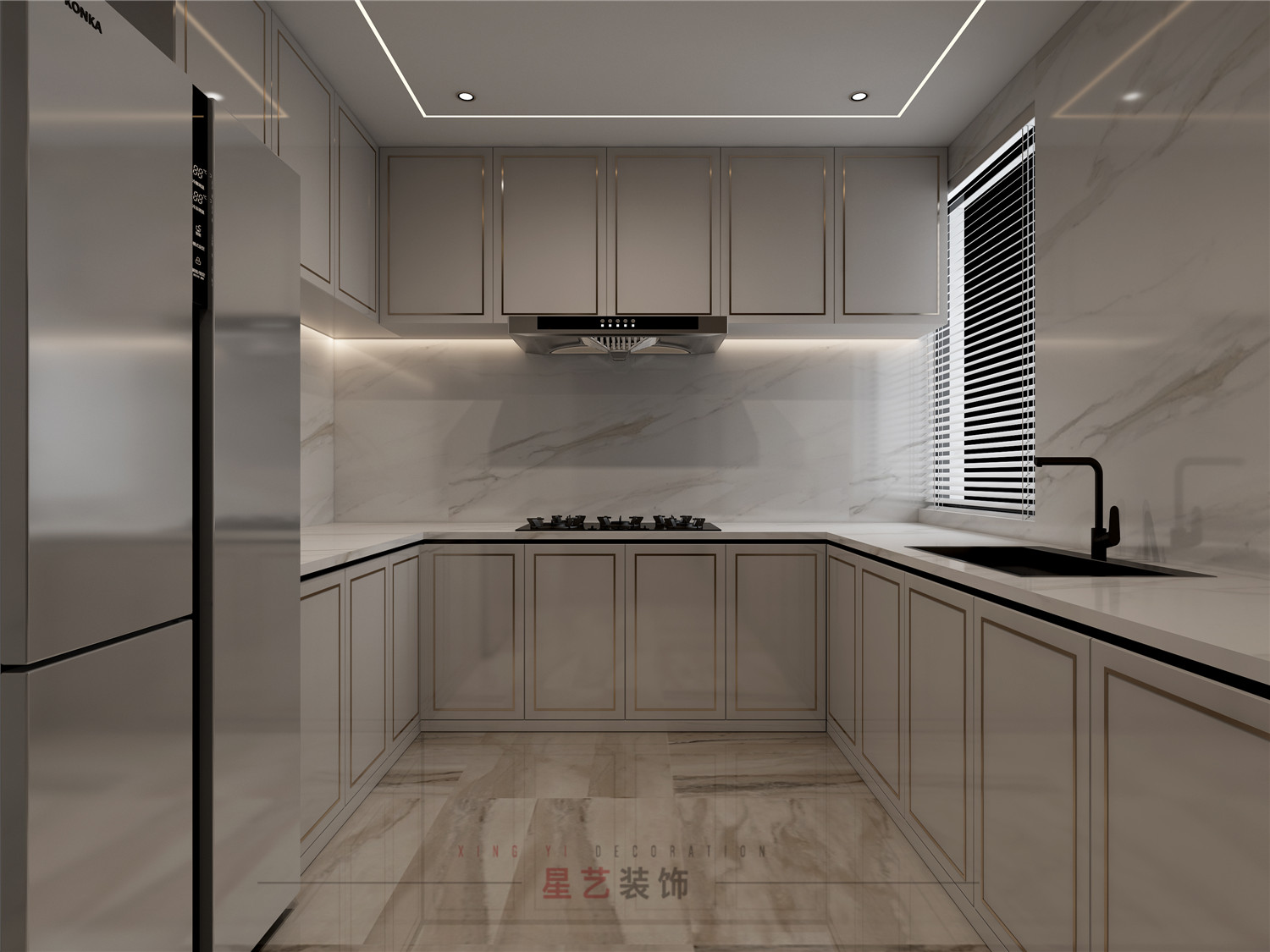 廚房以經(jīng)典的黑白組合搭配金屬邊框點綴,大理石墻面與地面相呼應(yīng),設(shè)計感、線條感、質(zhì)感,都到達一個適度的狀態(tài)。