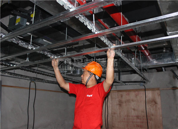 A、吊桿固定:沿主龍骨彈線位置,用沖擊磚打孔安裝頂爆固定吊桿。